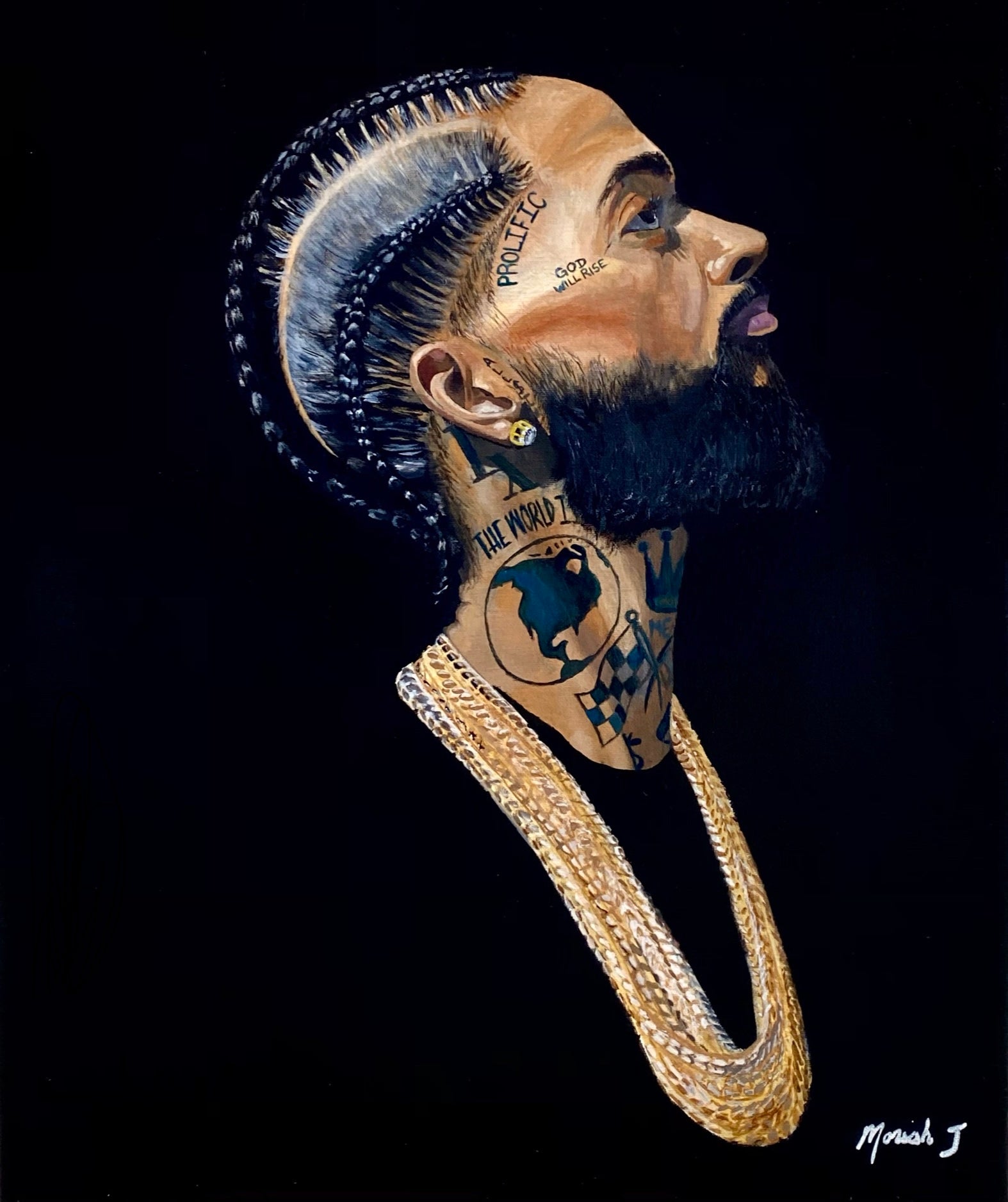 Original portrait of the late great Nipsey Hussle. An inspirational piece that reminds the viewer to keep their head up and keep going, no matter what.